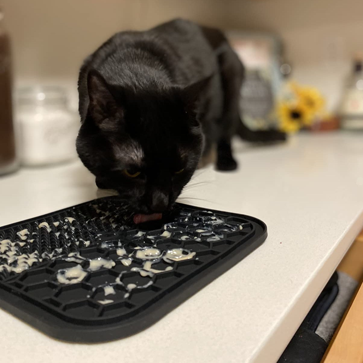 Simplemente coloca la alfombrilla sobre una superficie lisa, unta con su comida favorita (mantequilla de maní, paté, comida húmeda) o espolvorea con trocitos o snacks.